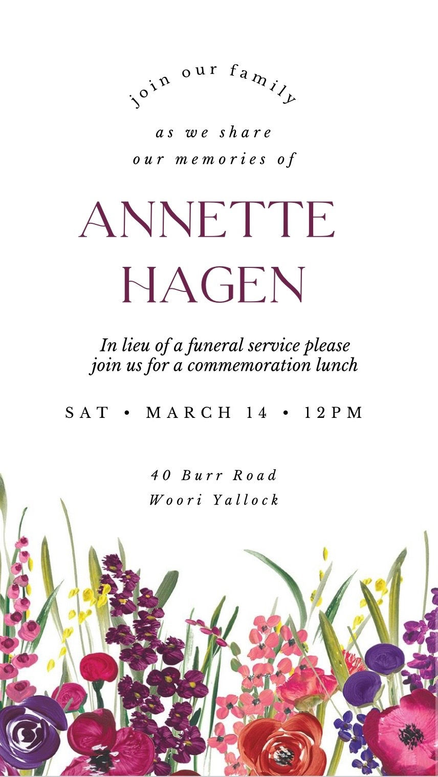 Commemoration lunch for Annette will be on Saturday March 14th 12.00pm at 40 Burr Road